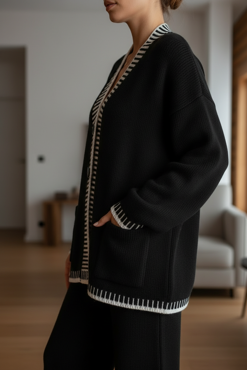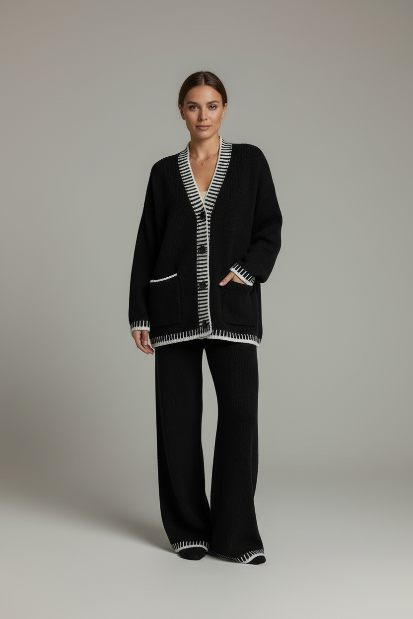 Oplev den perfekte blanding af stil og komfort med dette to-delte sæt. Sættet består af en afslappet cardigan og matchende vidde bukser, begge fremstillet i et luksuriøst, blødt strikket stof. Den varme brunlige nuance er elegant fremhævet med sorte kontrastdetaljer langs kanterne på cardiganen og buksernes linning, hvilket tilføjer et sofistikeret touch.
