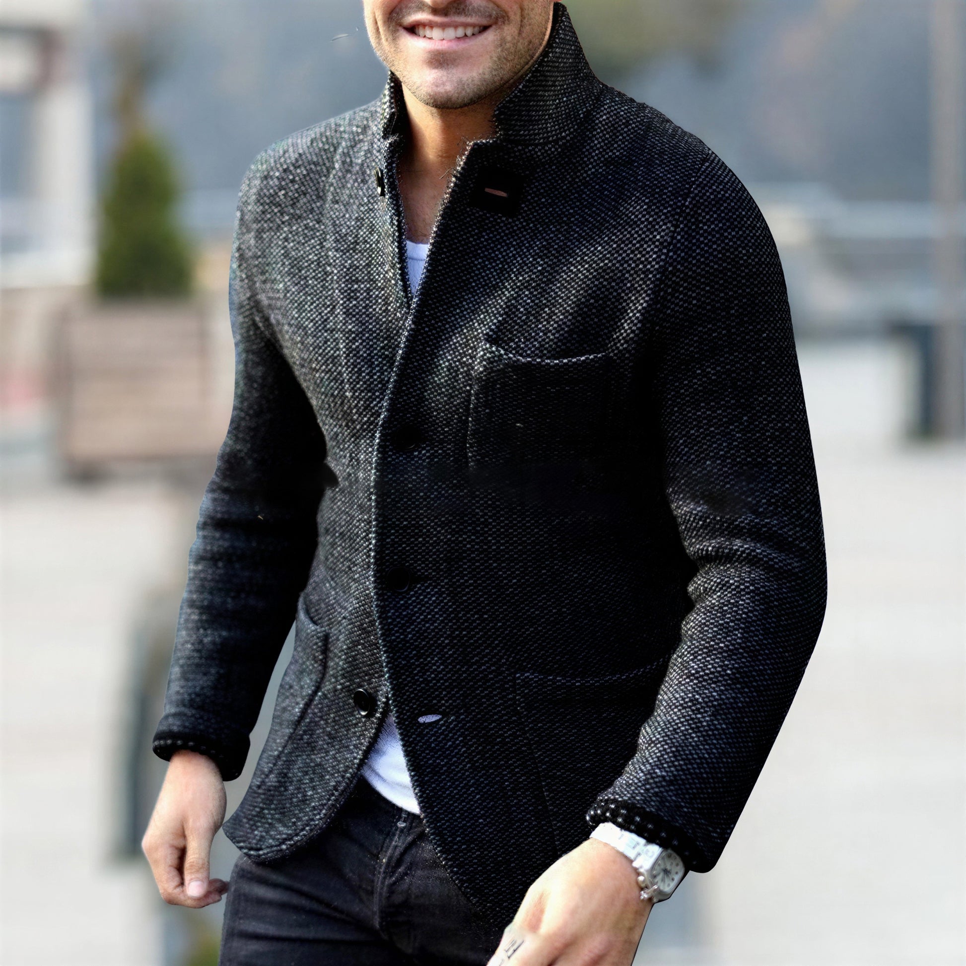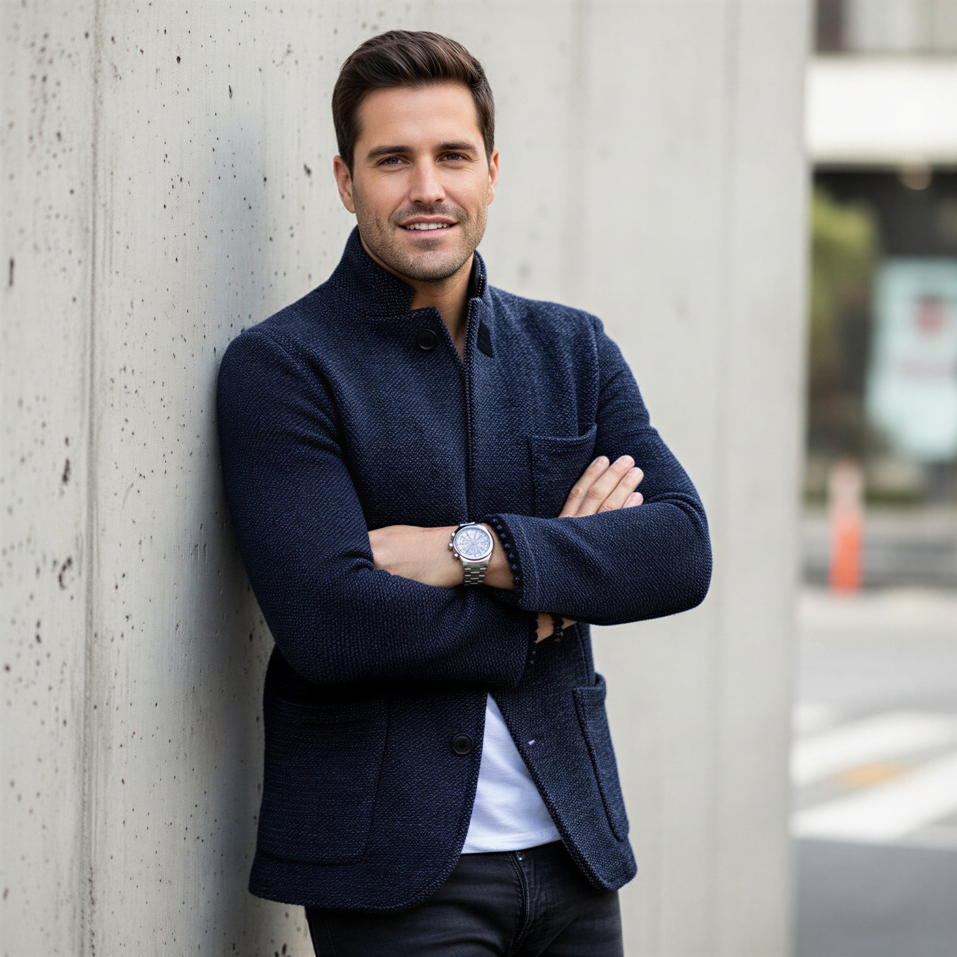 Denne mørkeblå blazer fra Norideen er det perfekte valg til den moderne mand, der søger en blanding af stil og komfort. Fremstillet i en lækker, tekstureret uldblanding, tilbyder denne jakke en uovertruffen følelse og et sofistikeret look. Med sin unikke stand-up krave og en klassisk tre-knaps lukning, udstråler den ubesværet elegance.