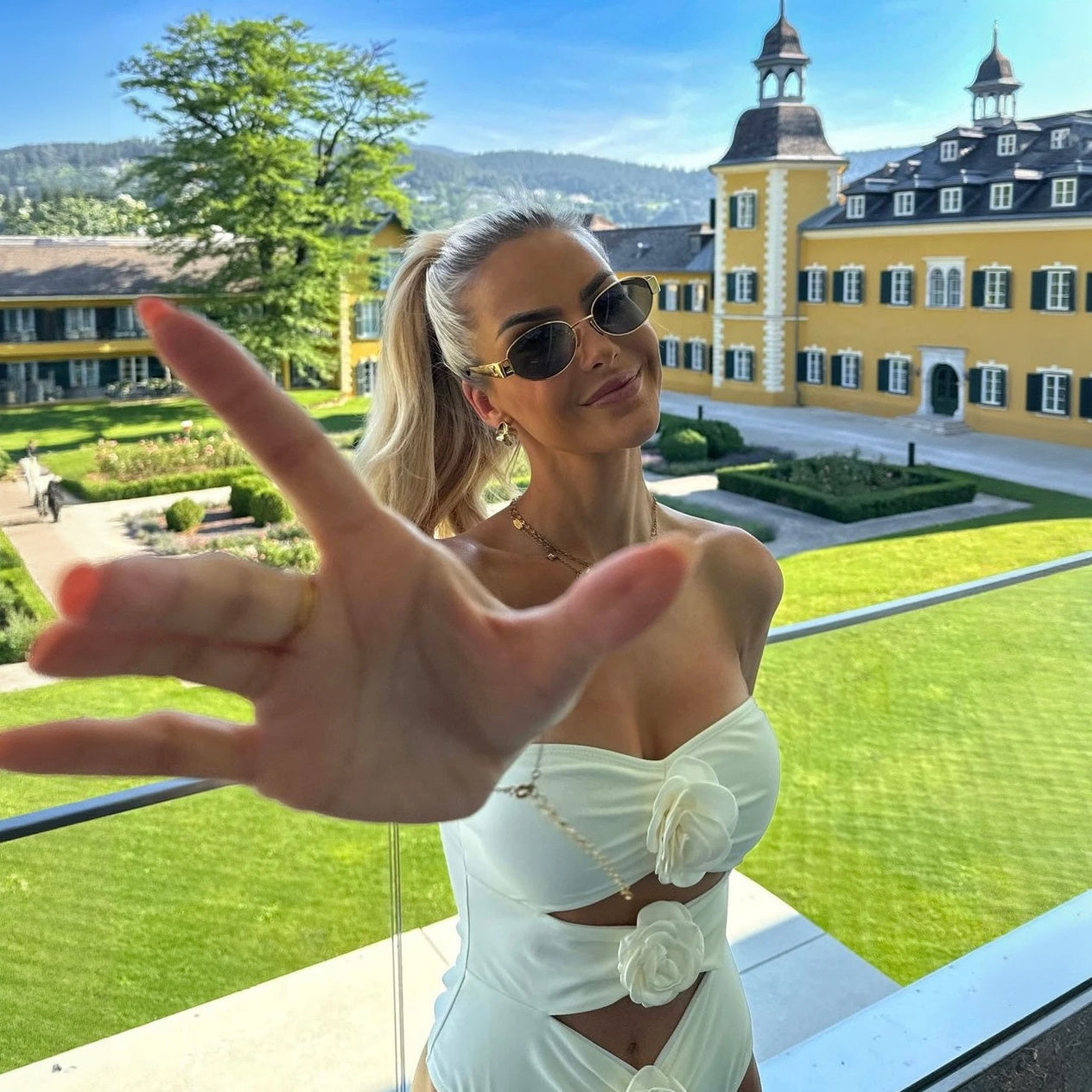 KLASSISK POOLSIDE CHIC: Sort badedragt, oversized skjorte og cat-eye solbriller.