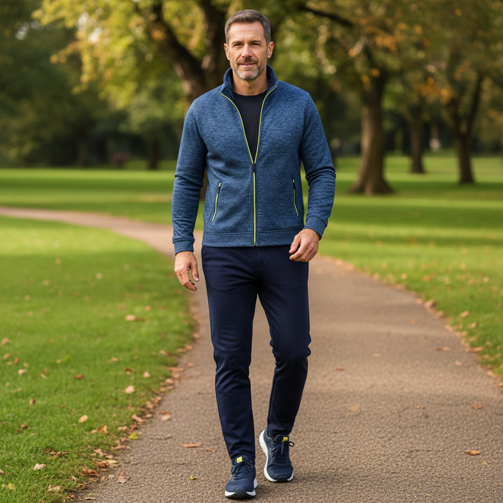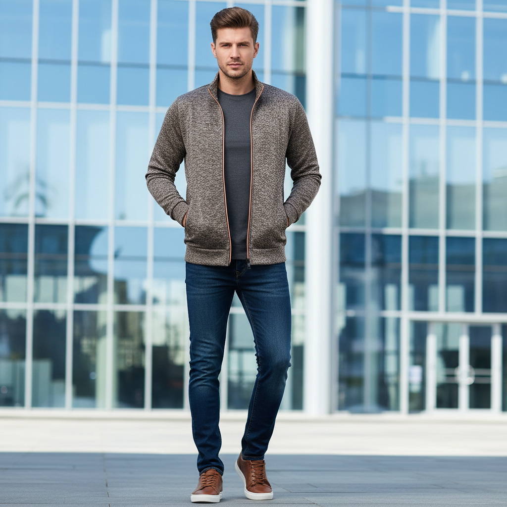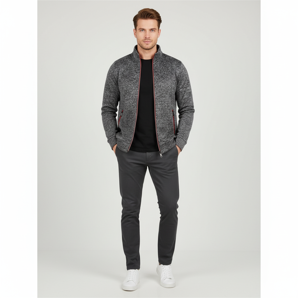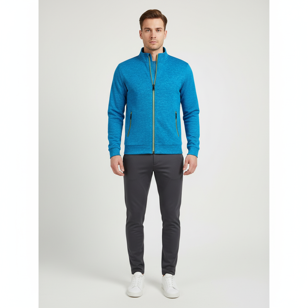 Opdag vores alsidige herrejakke, perfekt til den moderne mand. Den strikkede kvalitet giver en unik tekstur og komfort, mens den opretstående krave tilføjer et stilfuldt touch. Den iøjnefaldende neon gule lynlås giver et dynamisk og atletisk udtryk, der skiller sig ud.