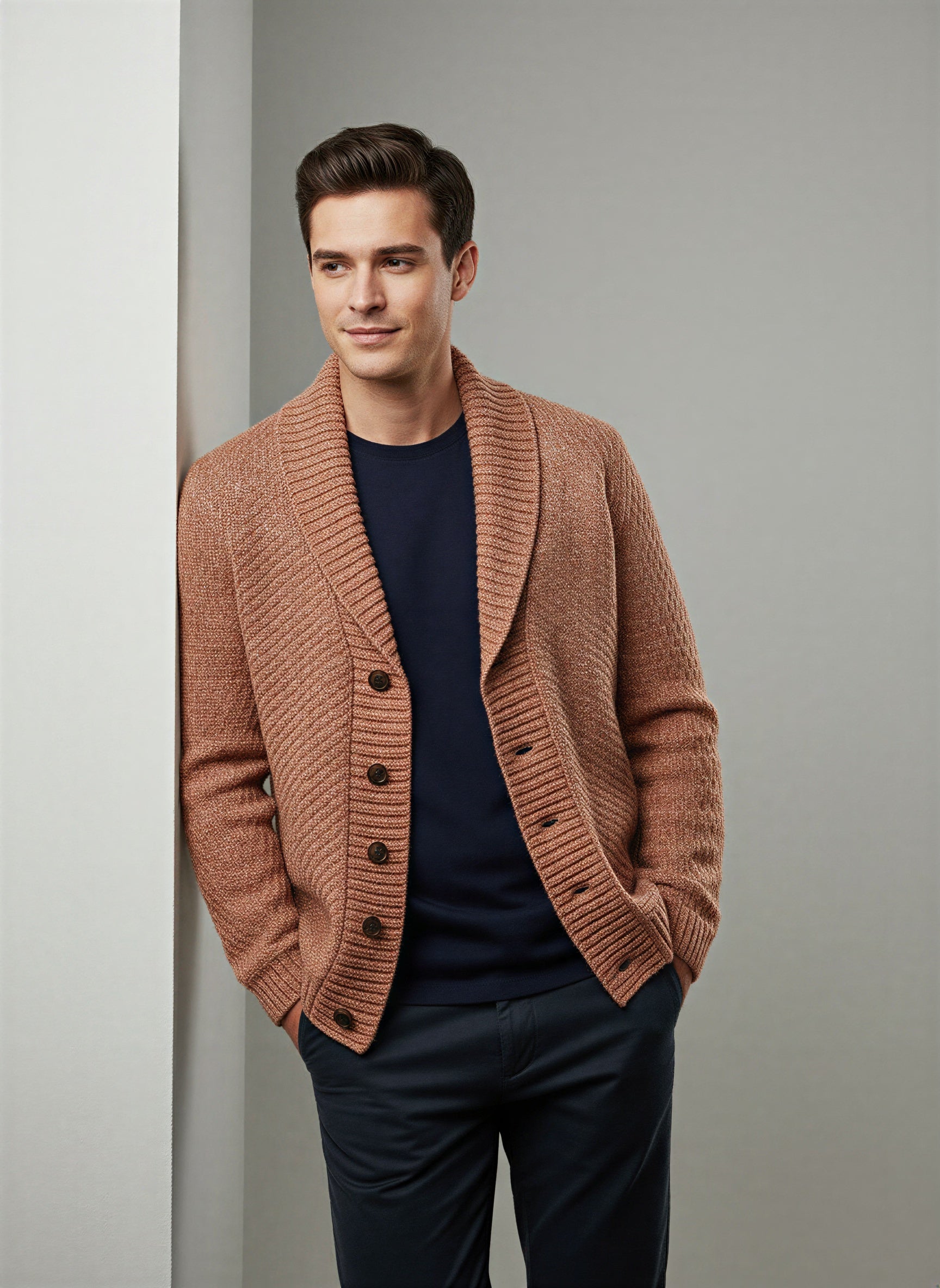Opdag den perfekte kombination af stil og komfort med vores moderne strik cardigan. Designet med en klassisk shawl krave og knaplukning, tilbyder denne cardigan en sofistikeret, men afslappet æstetik. Det unikke herringbone-lignende strikmønster tilføjer tekstur og dybde, mens ribstrikkede detaljer ved krave, manchetter og kant sikrer en perfekt pasform og ekstra varme.