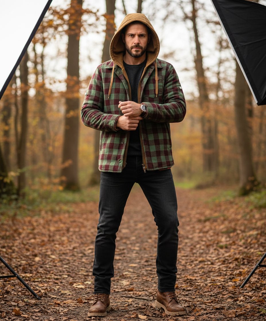 Giv din garderobe et friskt pust med denne iøjnefaldende jakke, der kombinerer forskellige ternede mønstre med solide blokke for et dynamisk look. Den integrerede, kontrasterende brune hætte tilføjer et ekstra lag af stil og varme, perfekt til de koldere måneder.